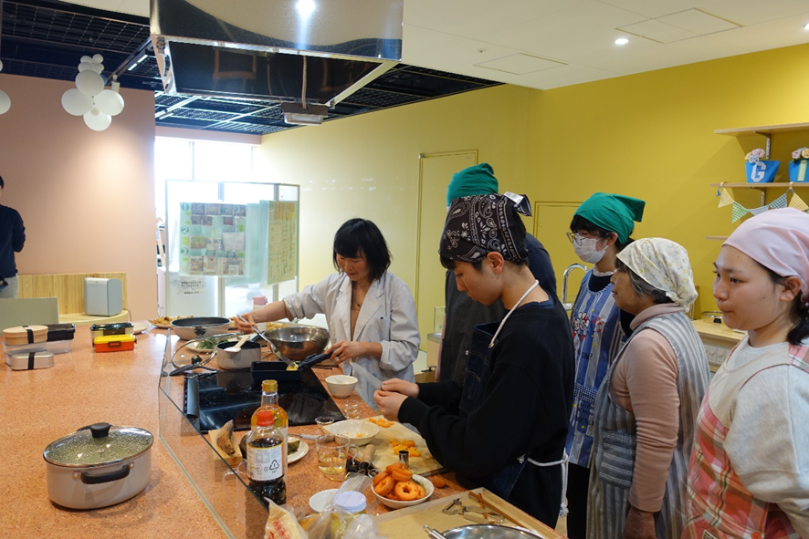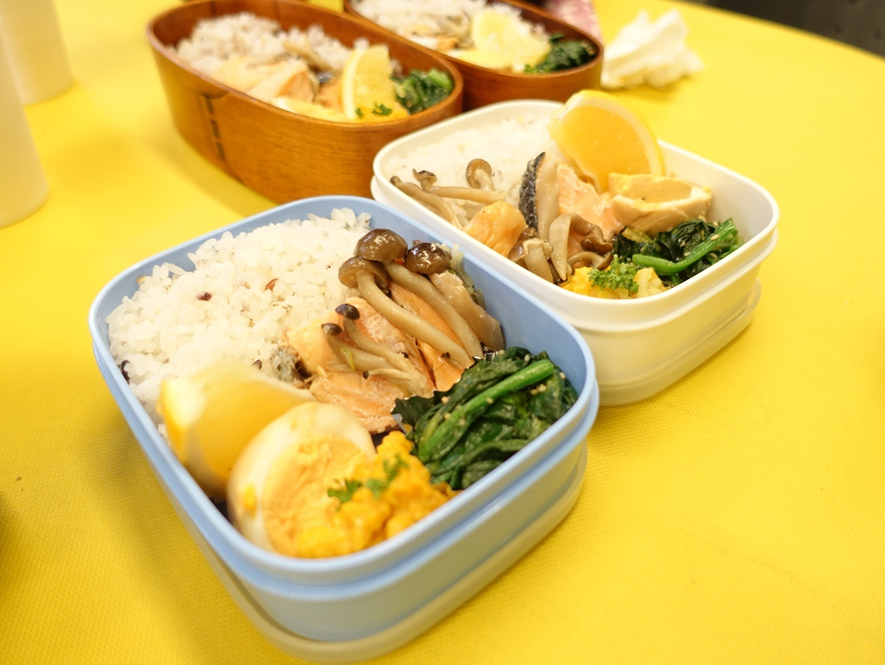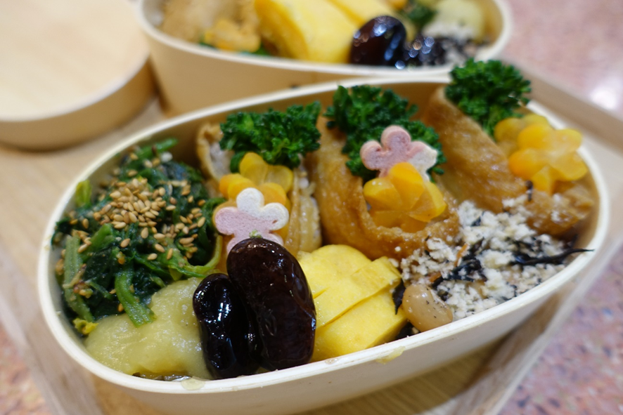 第1弾では参加対象者を高校生に限定しましたが、第2弾では中学生まで拡大して実施しました。卵焼き、いなり寿司、ひじきとおからのサラダ、くりきんとんなどをつくり、持参したお弁当箱につめて頂きました。