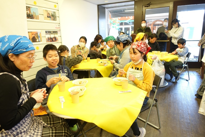 上州地粉を使った幅広の麺作りから始め、おっきりこみを皆で楽しく調理しました。調理した後は、おっきりこみの歴史についてミニレクチャーを行い、郷土の理解を深めながら、味わい深いおっきりこみを頂きました。