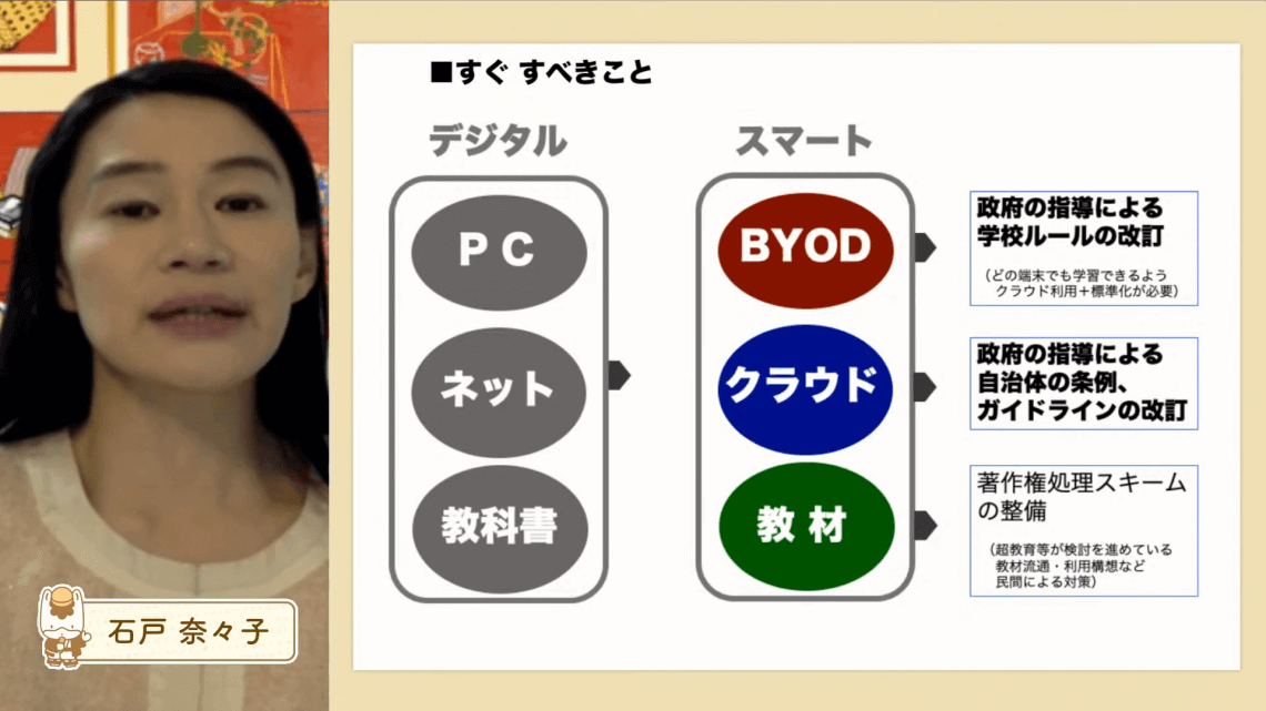 日本が次にすべきなのは、まず早急にスマート教育の環境整備にシフトすることです。さらには「超スマート」の教育と呼ばれるような環境整備に取り組まないといけないと思っています。私達はずっと、教育においては「インフラ整備」と「先端改革」の両方を同時に推進しなくてはいけないと主張してきました。先端改革というのは、学びの内容、環境、それから評価を大きく取り直すことです。