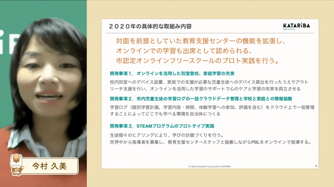 今村:全ては難しいと思いますが、学校が出す通知表を通した評価に加え、例えば教育支援センターを仲介した定性的な情報も家庭にフィードバックしてから仕組みを作っていくと、その子どもが学ぶことを止めずに続けていくことができるのかなと思いました。
