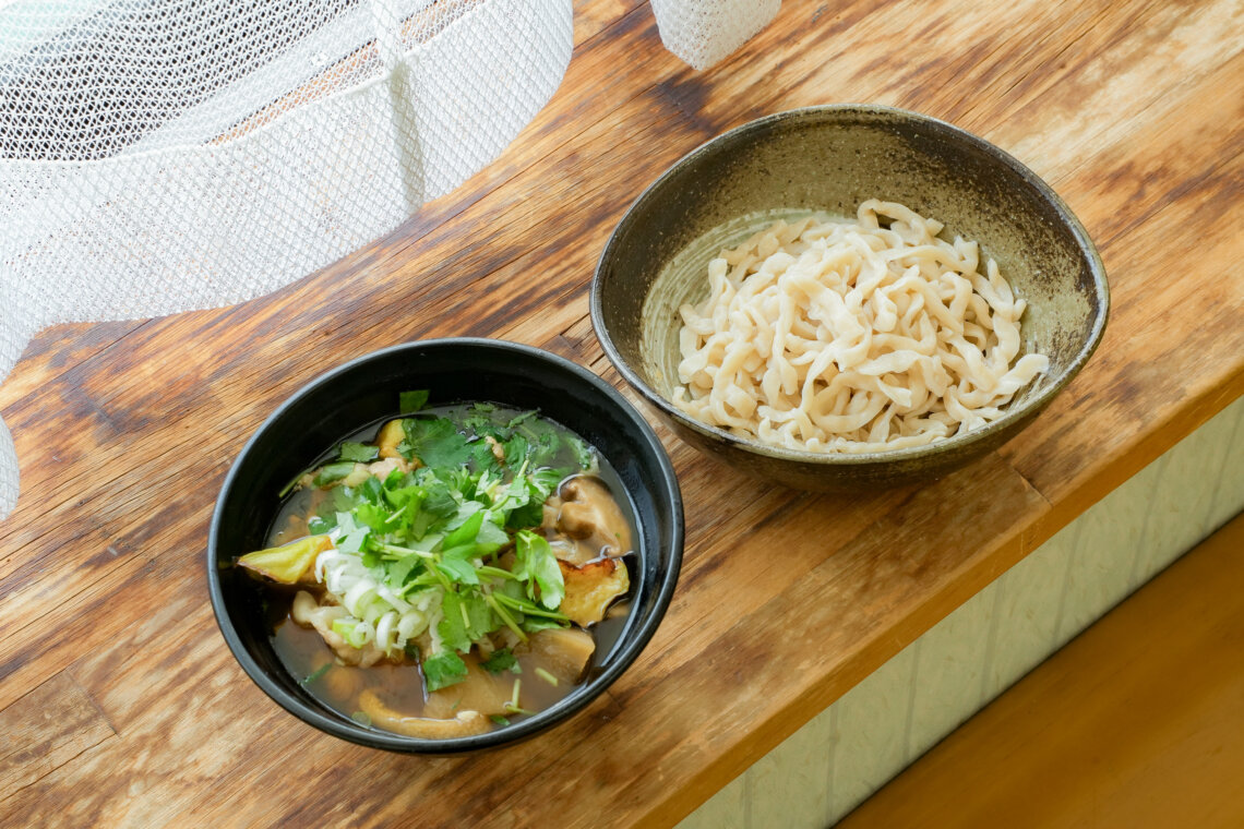 つけ汁は前回の田舎汁をイメージした「具だくさんのつけ汁」と、赤城地鶏と群馬県産ネギを合わせた「地鶏のつけ汁」の2種類を試作。どちらも醤油ベースの汁ですが、「具だくさんのつけ汁」は野菜の甘味を感じるほっこりした味わいで、大きな具材がたくさん入っていて食べ応えがあります。一方、「地鶏のつけ汁」は濃い味付けでコク深く、洗練された印象。わらびやほうれん草、ネギといった具材がちょうどいいアクセントとなり、万人受けする一杯です。