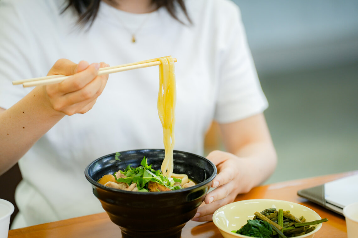 2025年10月24日には2回目の試食会を開催。前回のメンバーに加え、食ラボメンバーである「㈱オープンハウスグループ」サステナビリティ推進部・池田悠人さんも参加し、ブラッシュアップされた「藤原うどん」についての検討会を行いました。