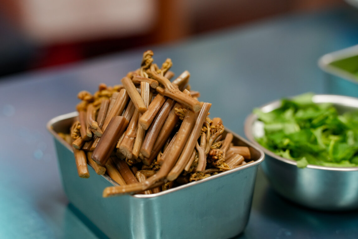 さらに、試食会では地域の方から「わらびの塩漬け」を差し入れしていただきました。松本義親さんは「春先の藤原地域ではわらびがよく採れるので、自宅で塩漬けにして一年中食べる人が多くいます。こうした保存食にも目を向けて、藤原地域の色を出したいですね」と話します。