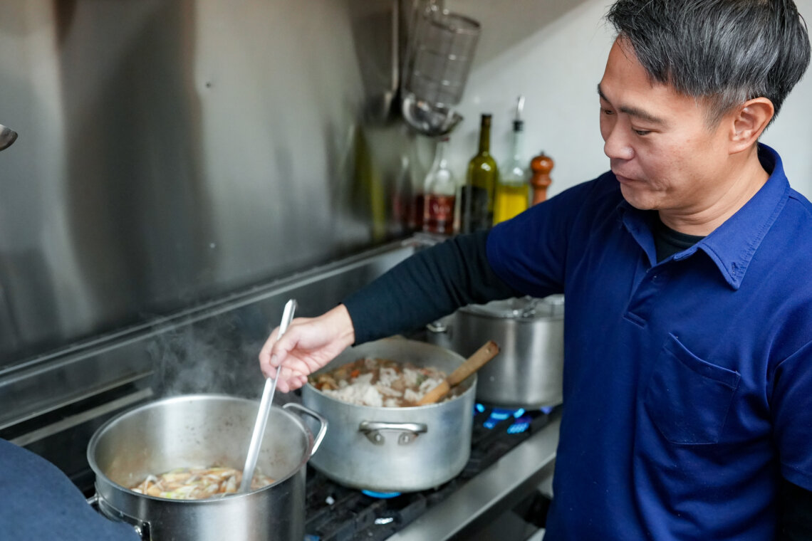 調理を担当した松本亨太さんは「地域の方に馴染みのある料理について尋ねたところ『その日に採れた旬の野菜や山菜、キノコをたくさん入れた汁物が家庭の味だ』と話す人が多くいました。そこで、初めて藤原地域を訪れる人にも興味を持ってもらえるような地域色のあるメニューを作りたいと思い、つけ汁うどんの開発を決めました」と話します。