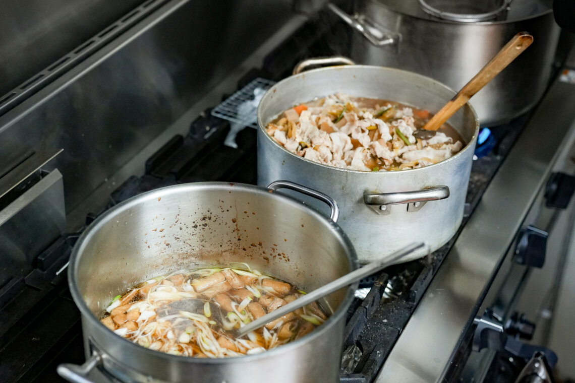 つけ汁は群馬県産もち豚の薄切り肉や藤原地域で採れる山菜を始め、ダイコン、ニンジン、しめじ、こんにゃく、ナス、油揚げ、椎茸、ゴボウなど10種類以上の具材を投入。たくさんの具材をしっかり煮込むことで、素材のコクと旨味が詰まったつけ汁が試作されました。