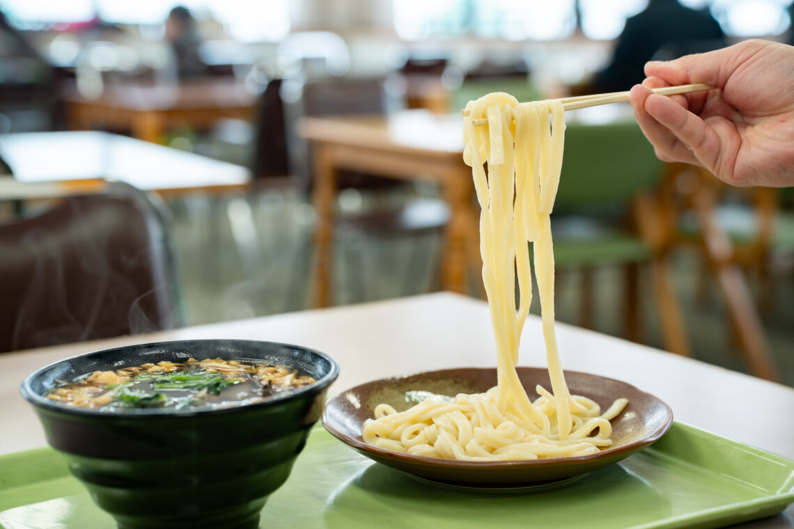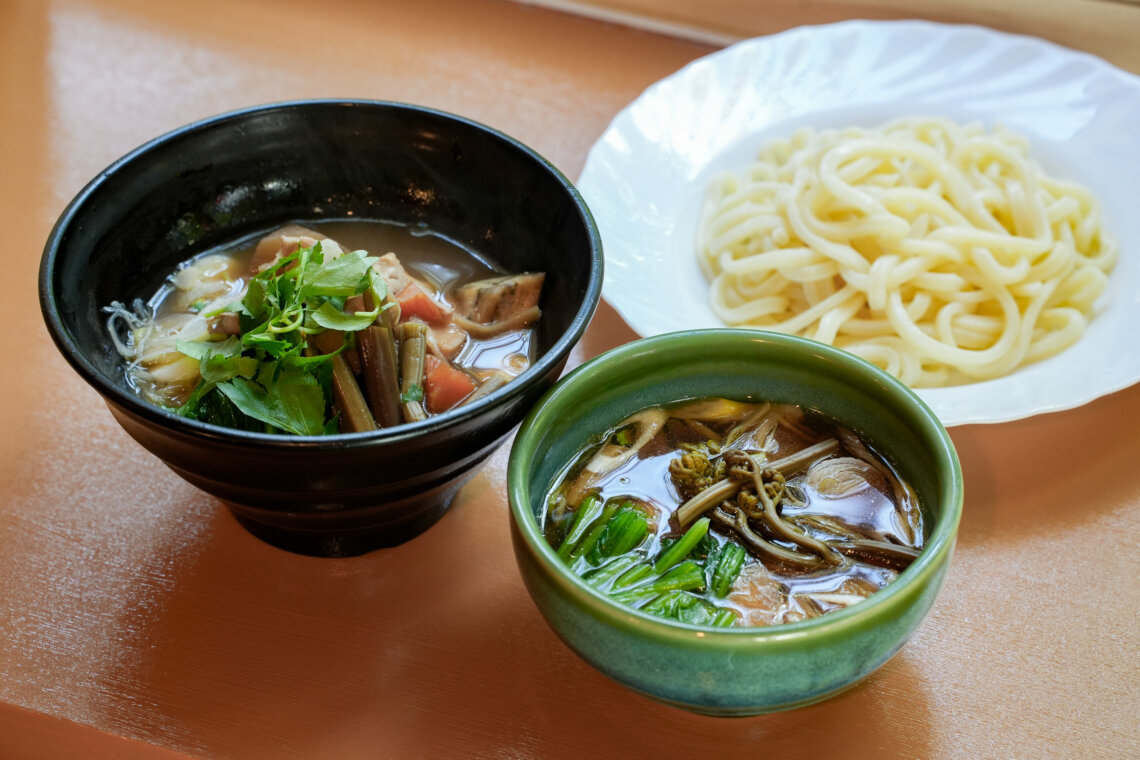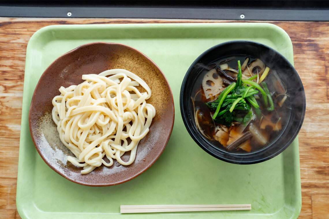 うどんは地域で親しまれている醤油ベースの汁に、麺をつけて食べる「つけ汁うどん」スタイル。