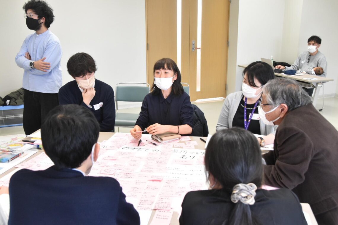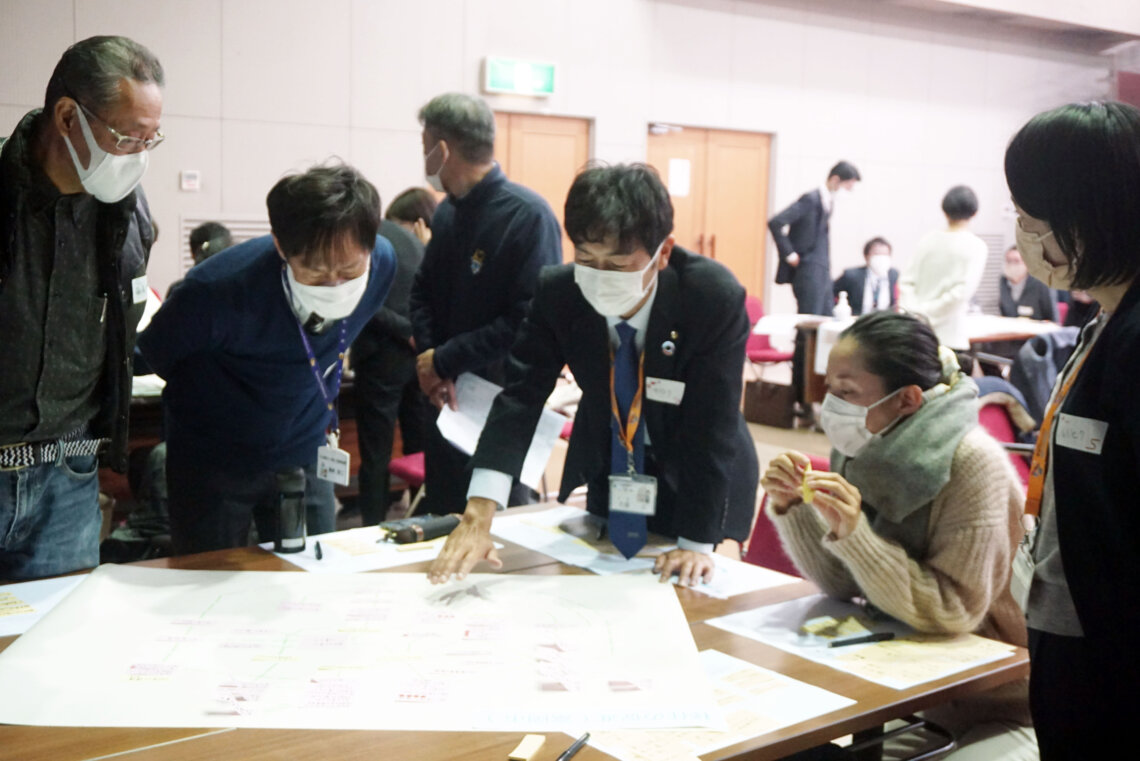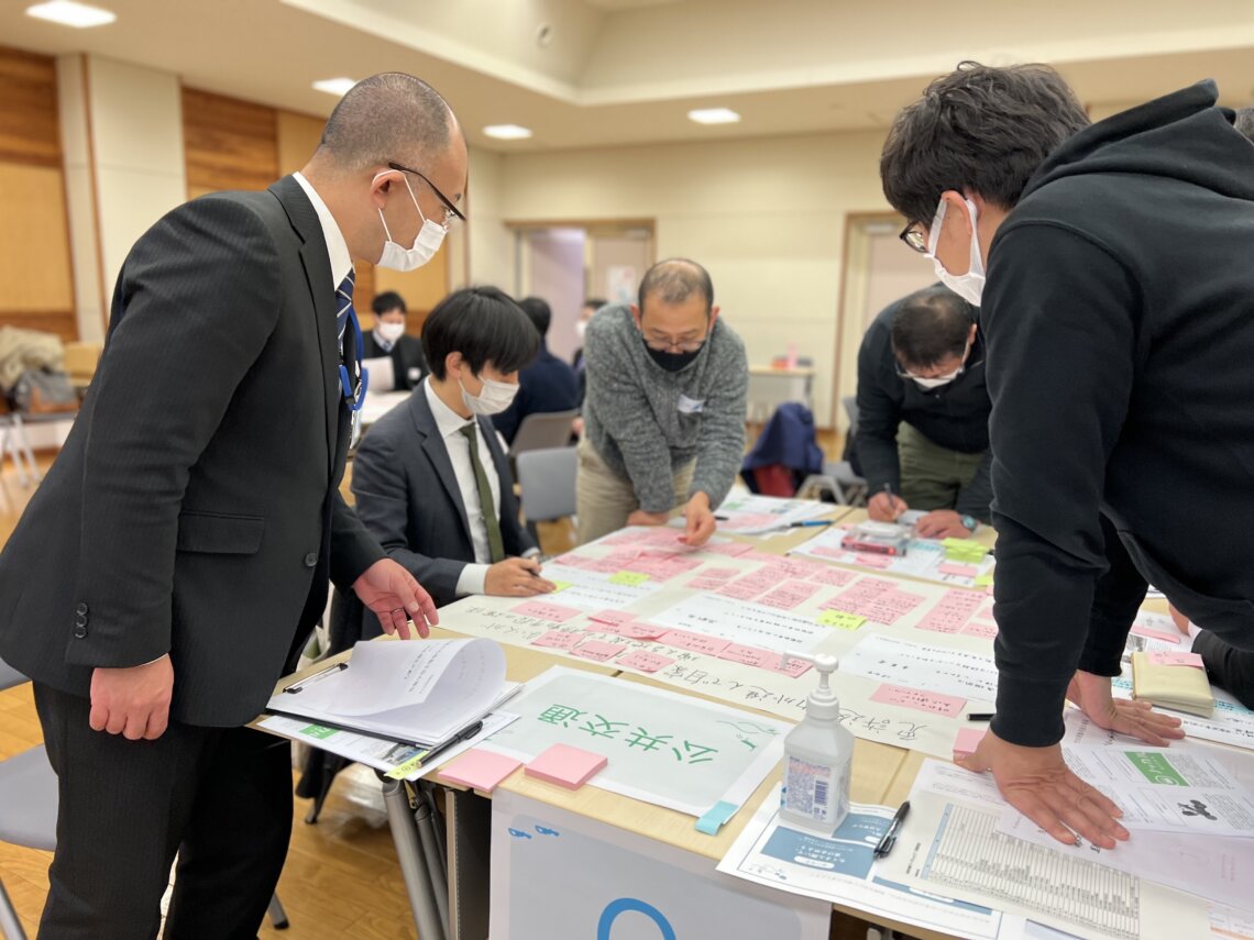 このワークショップでは、各テーブルに話し合いをサポートする行政職員(=ファシリテーター)を配置。この行政職員は、継続的に地域を支援できる体制づくりにつながればと「対話の場づくりについてのスキルと知識の習得」にも取り組みました。実際、多様な参加者の声を引き出したり、話し合いを進めていったりという場面でファシリテーターが活躍し、その成果として、地域別のワークショップを終えるとたくさんのアイデアや声が生まれていました。
