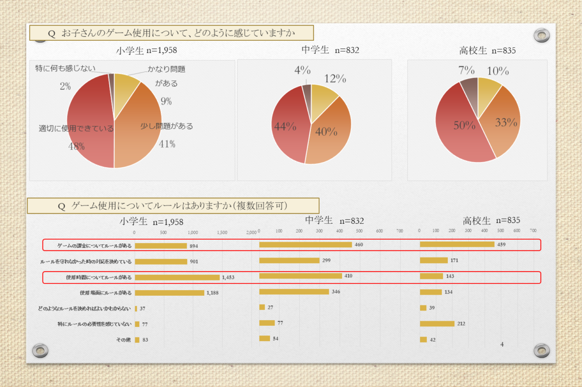 初めに、群馬県障害政策課より、子どものゲーム使用に関する実態調査の結果を報告します。この調査は、令和3年12月に、県内の小学生、中学生、高校生の保護者に向けて行ったものです。3,551人の保護者から、4,147人の子どもについて回答をいただきました。