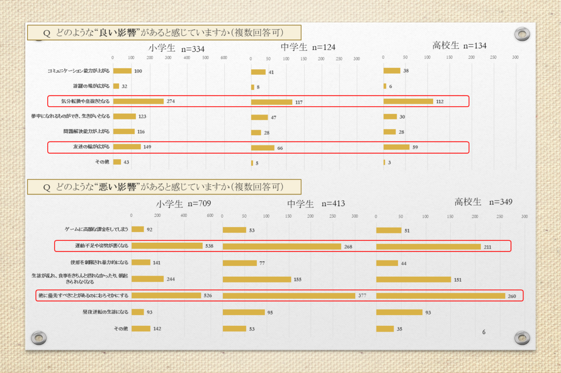 ゲームが子どもに与える影響については、良いもの、悪いもの共に様々な声が上げられました。「気分転換や息抜きとなる」「友達の輪が広がる」といった良い影響、「運動不足になる」「他の優先すべきことをおろそかにしてしまう」といった悪い影響は、どの年代の子どもに対しても保護者が感じていることが分かりました。保護者からの意見を見ても、ゲームを悪いものとするのではなく、ゲームを通して学べること、ゲームでしか体験できないことにも目を向けようとする声がありました。