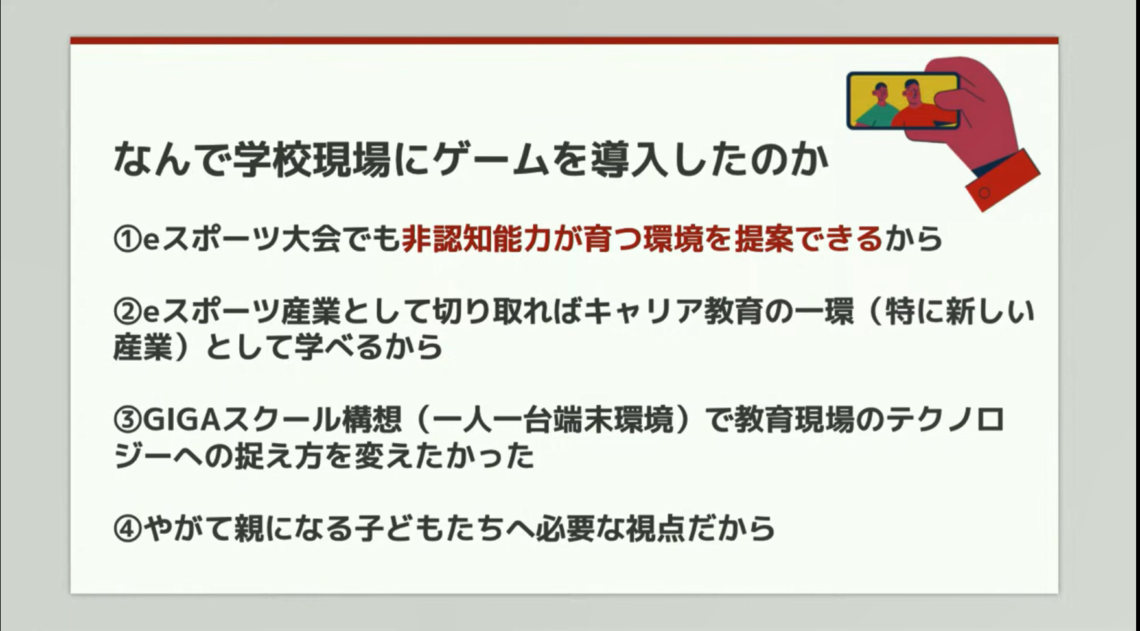 おまけに、eスポーツはこれからの新しい産業として切り取ることもできます。テクノロジーの変化によって社会が変容していく中で、eスポーツ産業をどう捉えるか考えることも、子どもはもちろん、我々教員や学校にとっても非常に有益な学びになります。