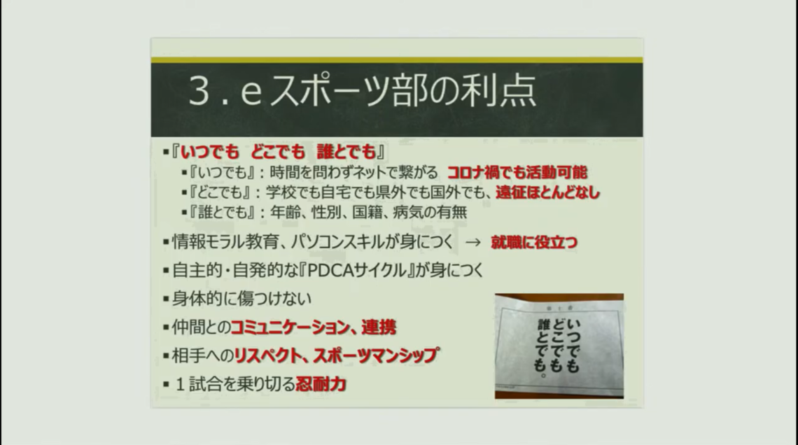 高校のeスポーツ部は、「いつでも、どこでも、誰とでも」参加できるという利点があります。「いつでも」とは、時間を問わず、コロナの流行下でもネットでつながって部活ができることです。「どこでも」は、場所を問わずに遠方の大会にも参加できることです。「誰とでも」は、年齢、性別、国籍などを超えて交流できることです。本校では筋ジストロフィーの患者さんと交流試合をしています。