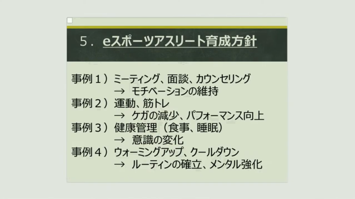 柴原 本校は部活動として取り組んでいますので、学校生活をおろそかにすると部活動もできなくなるという点が、依存症にならないために役立っていると思います。また、プロになるためには大会に勝たなければなりませんが、勝つためには長い時間集中力を保てるよう睡眠、食事、運動が必要になってきます。また、頻繁なミーティングやカウンセリングで本人の問題点を洗い出すことも、依存を防ぐことにつながると思っています。