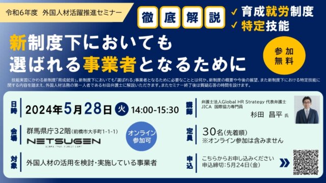 技能実習にかわる新制度「育成就労」。新制度下においても「選ばれる」事業者となるために必要なこととは何か。本セミナーでは、新制度の概要や今後の展望、また新制度下における特定技能に関する内容を踏まえ、外国人材法務の第一人者である杉田弁護士に解説いただきます。