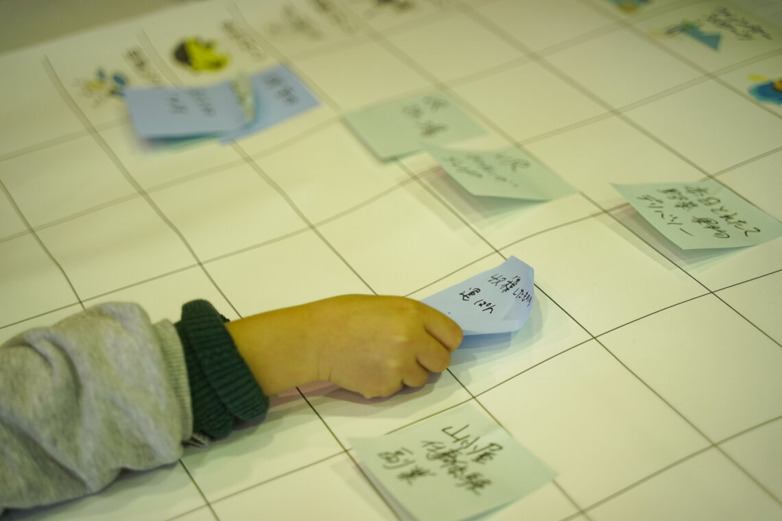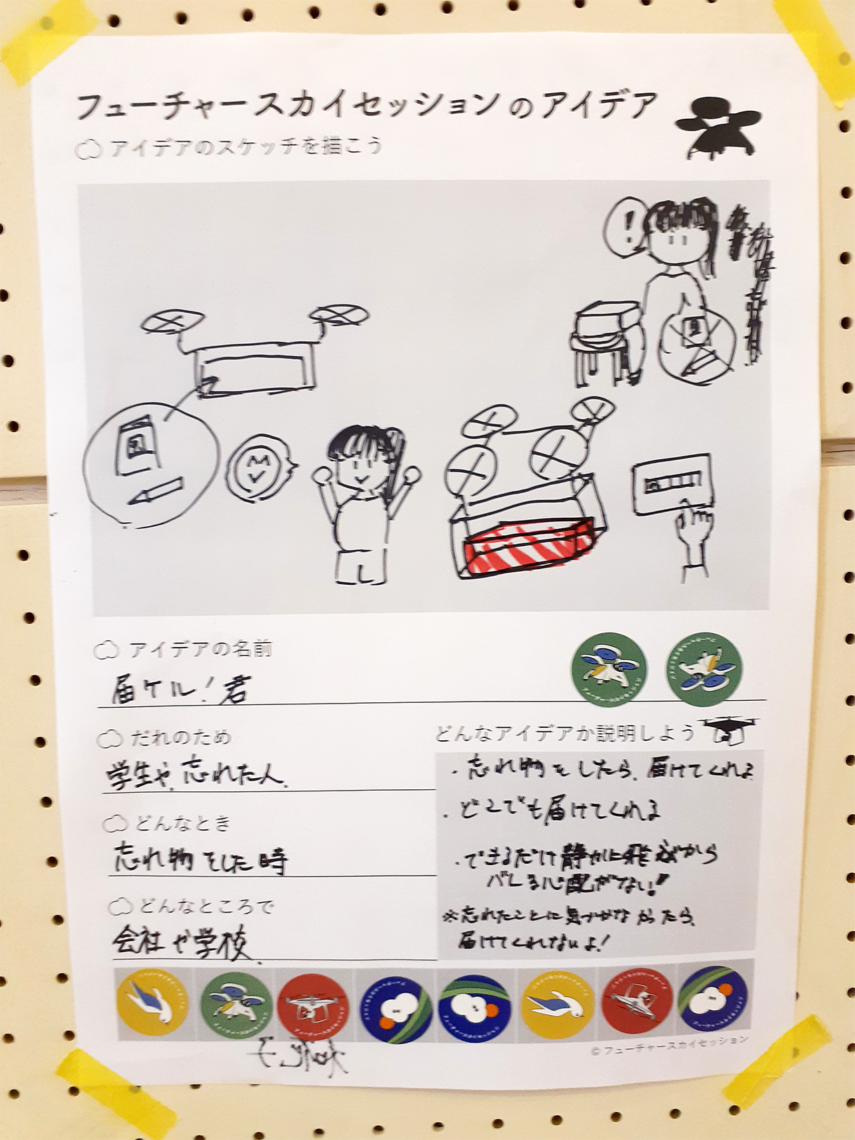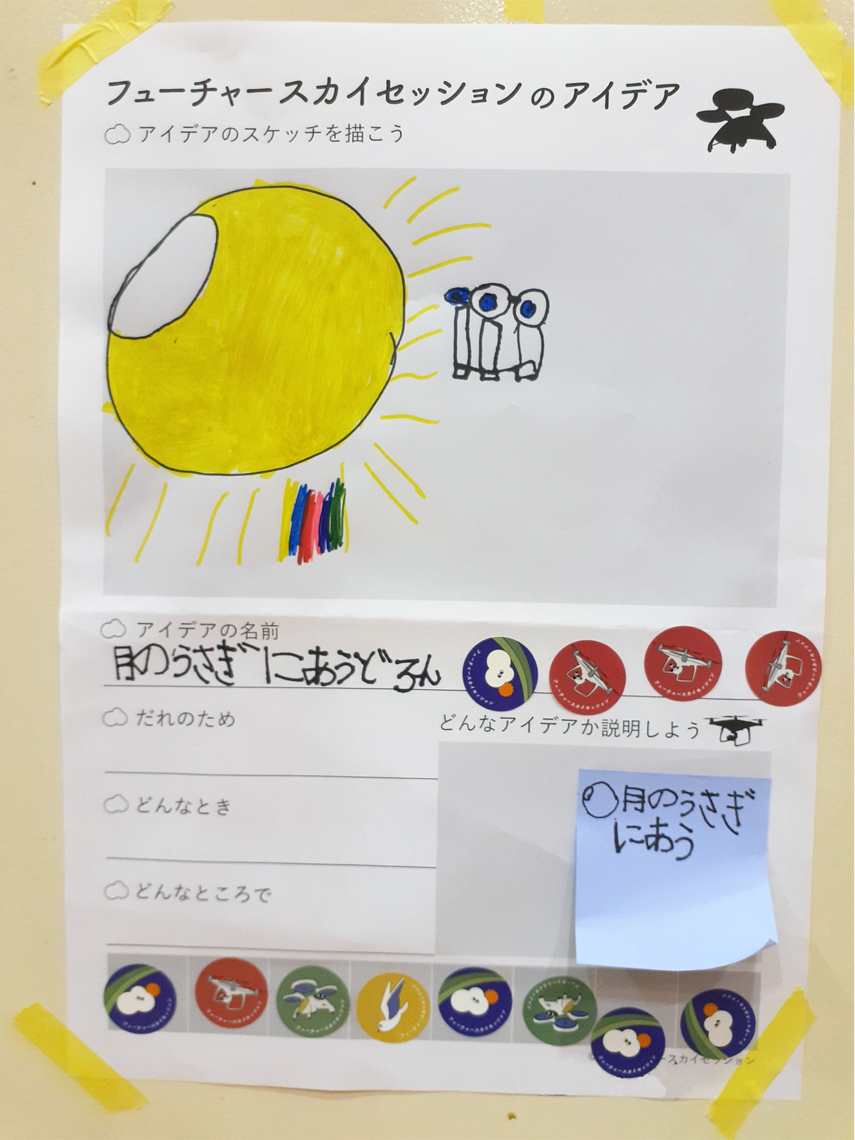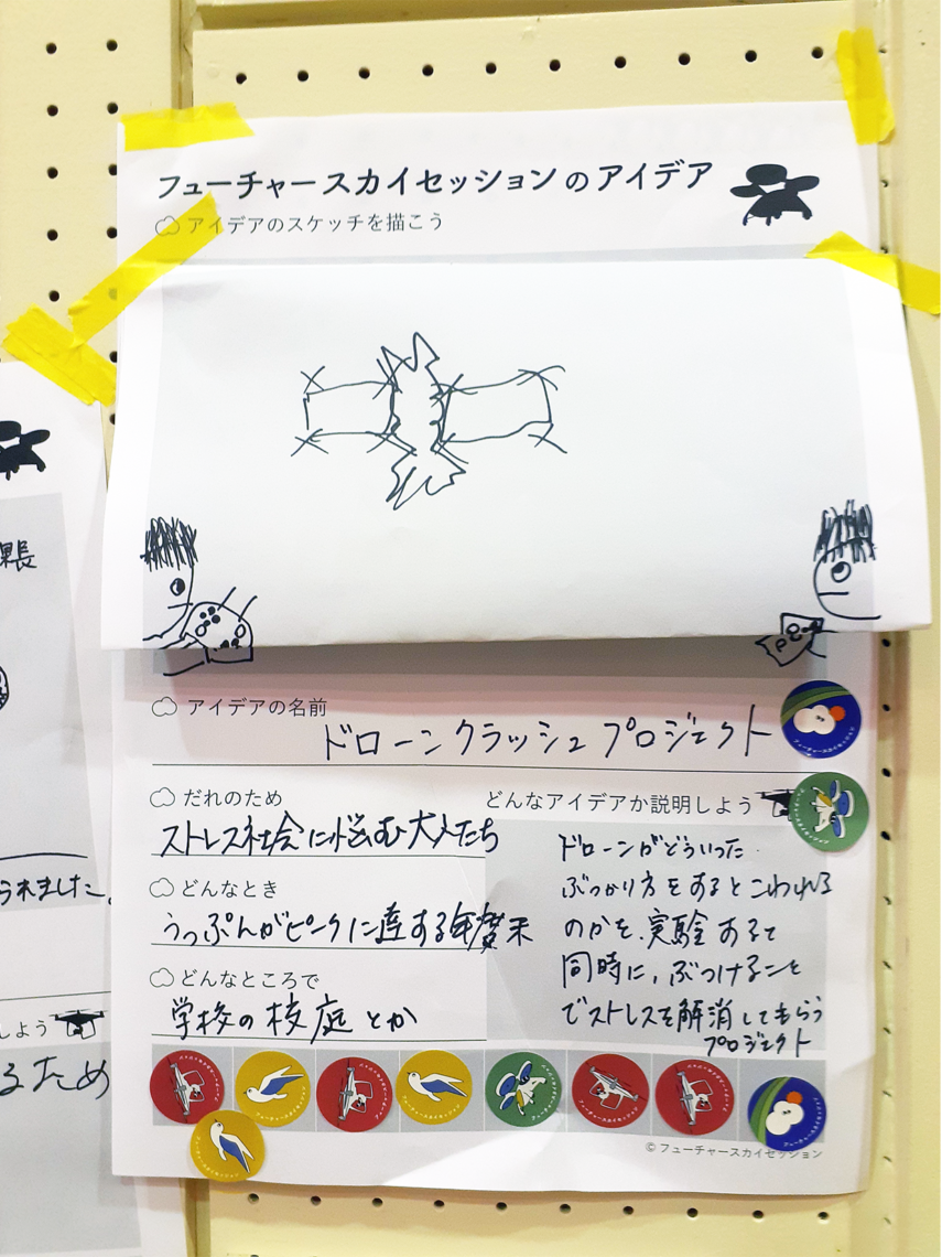 その後、一つのアイデアに絞って活用風景をスケッチし、発想を具体的に形にしていきます。文字で書くことが苦手な子どもも、イラストにすることでワクワクしながら創作を楽しめたようです。付箋の言葉から生まれた豊かなイメージが壁に貼りだされ、皆で作品を見て話をしながらポスターセッションは終了しました。