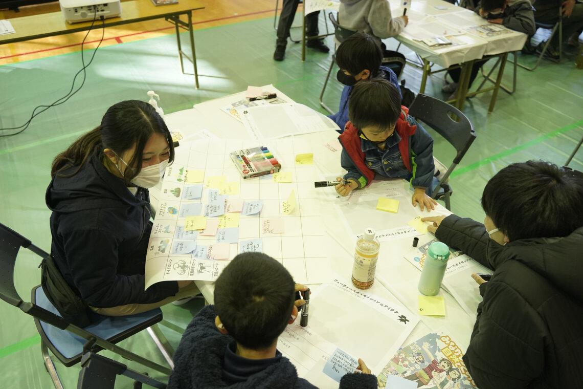 大人も子どもも一緒になってテーブルを囲み、アイデアを付箋に書きながら模造紙に貼り付けていきます。途中で手を止め他グループの模造紙を見てまわりながら、「ここのテーブルは数がすごいな」「こちらはゲームと空飛ぶクルマを合わせているよ」と互いに刺激を受ける様子も見られました。大人たちの話しかけによって発想が進んだ子どもも、子どもたちのアイデアに良いヒントをもらった大人もいたようです。互いに創発しあうことでワークショップは進み、グループごとにたくさんのドローン活用方法を思いつきました。