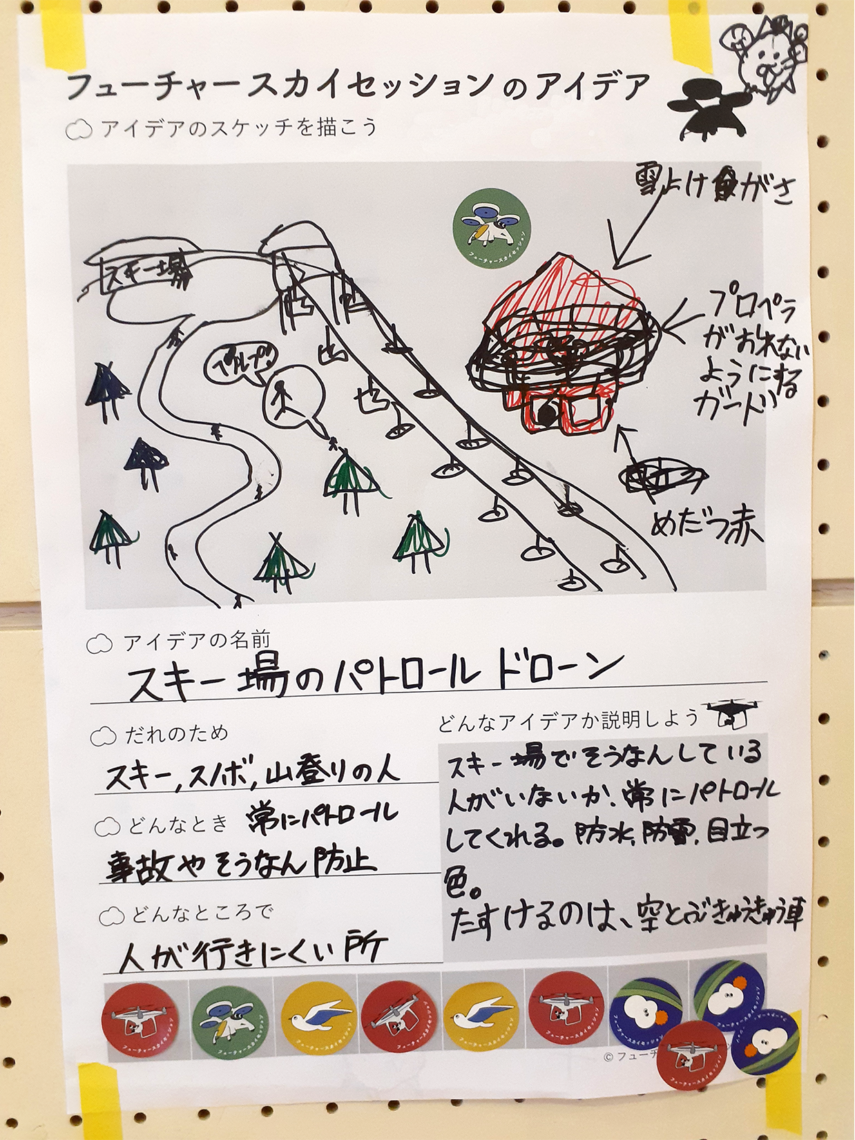 「農業とドローンを組み合わせれば、畑に行かなくても肥料を撒いたり収穫したりできるかな」「みなかみ町の温泉地をドローンで移動できると良いよね」「子どもやお年寄りの話し相手になったり、見守ってくれたりするドローンが欲しい」と子どもも大人も活発に意見を交わして盛り上がったワークショップ。素敵なアイデアスケッチがたくさん生まれた会場から、いくつか事例をご紹介したいと思います。