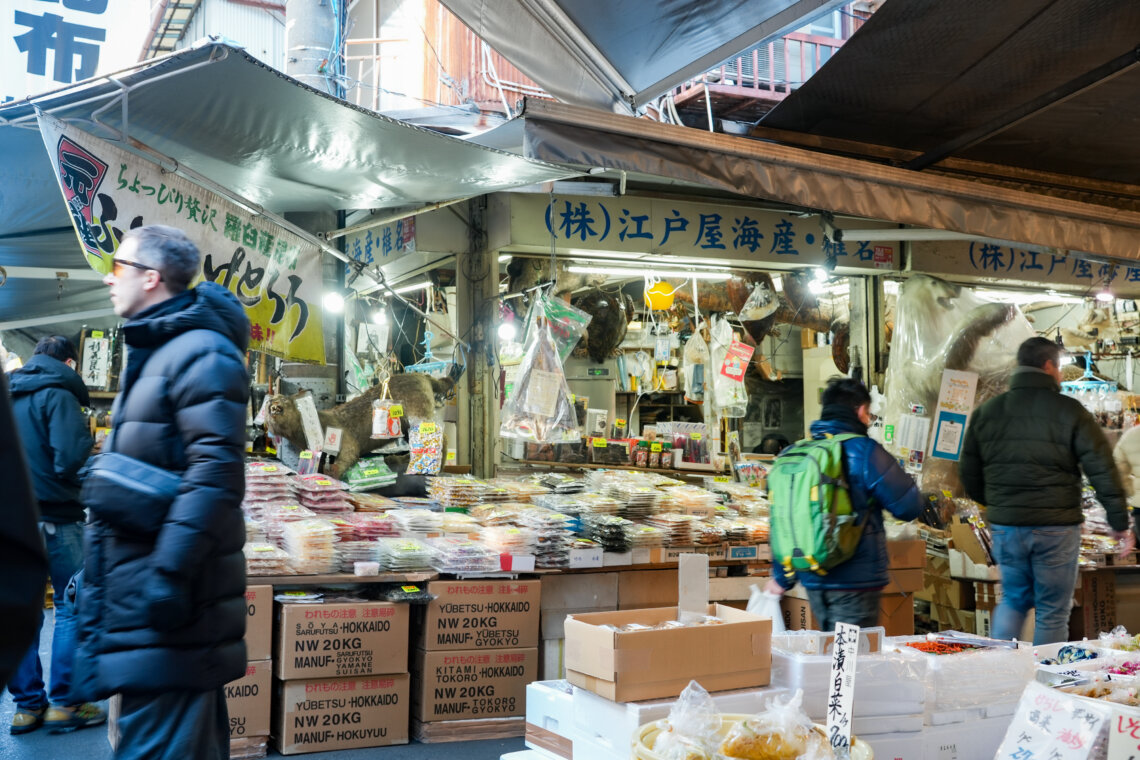 まずは、魚介類や特産品が所狭しと並ぶ商店街のエリアへ。駅周辺は高層ビルも多い築地ですが、ここに足を踏み入れると一気に雰囲気が変わります。