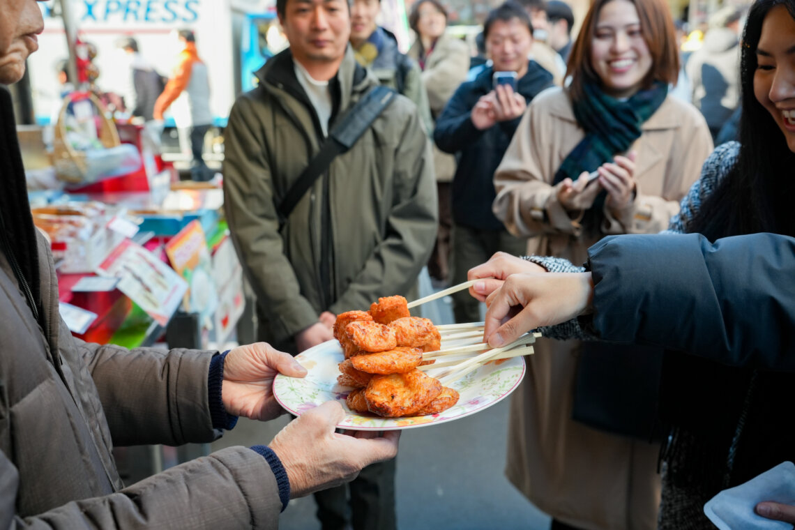 ツアーの目玉は、なんといってもフード。さつま揚げ、卵焼き、ステーキなど、築地の職人の技が光る数々の食べ歩きグルメの中から西田さんがおすすめするものをいただきました。