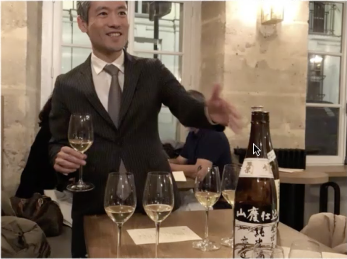 石田陽介(以降、石田) はい。では、自分の活動を象徴的に伝える写真を使って自己紹介していきます。こちらは2018、19年頃、私がパリの日本料理店の店長兼ソムリエ兼利き酒師をしていた時の写真で、お客さまに日本酒の説明をしているところです。2020年まで3年半ほどの決して長くはないヨーロッパ生活の中で、食にこだわりのあるフランス人や日本料理に興味のあるEU圏内の方々が笑顔で帰っていただけるよう、精一杯務めてきました。