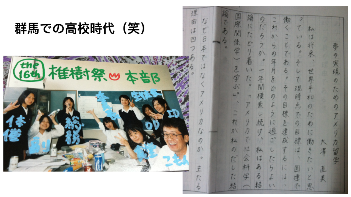 松井田で虫なんか追いかけていましたから、平凡で幸せな群馬は大好きでしたが、世界には恵まれない環境の人たちもたくさんいる。群馬は大丈夫だから、私は世界に出ようと思って、高校2年の時にアメリカ留学を決意しました。