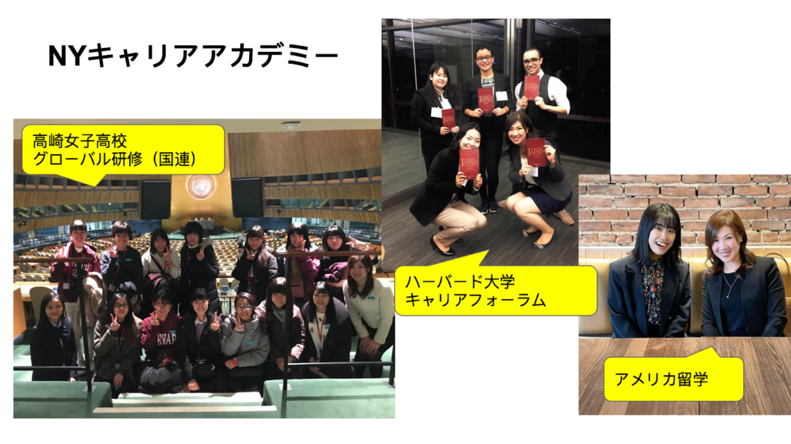 大澤直美(以降、大澤) はい。私はNYキャリアアカデミーという会社の代表として、簡単に説明すると“グローバルに生きる(生きたい)人々の支援”をしています。今日は高女の学生さんもいらっしゃるということで、左の写真は高女のグローバル研修です。今はコロナで中止になってしまいましたが、毎年高女からニューヨークに40人くらい来ていました。