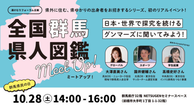 全国群馬県人図鑑(-グンマーズ-)は、さまざまな分野で活躍する県ゆかり・県外在住の先輩方をペアでお招きし、お二人の母校の現役高校生も交え、学生時代の思い出や故郷への熱い思いを聞き出していくトークセッション。