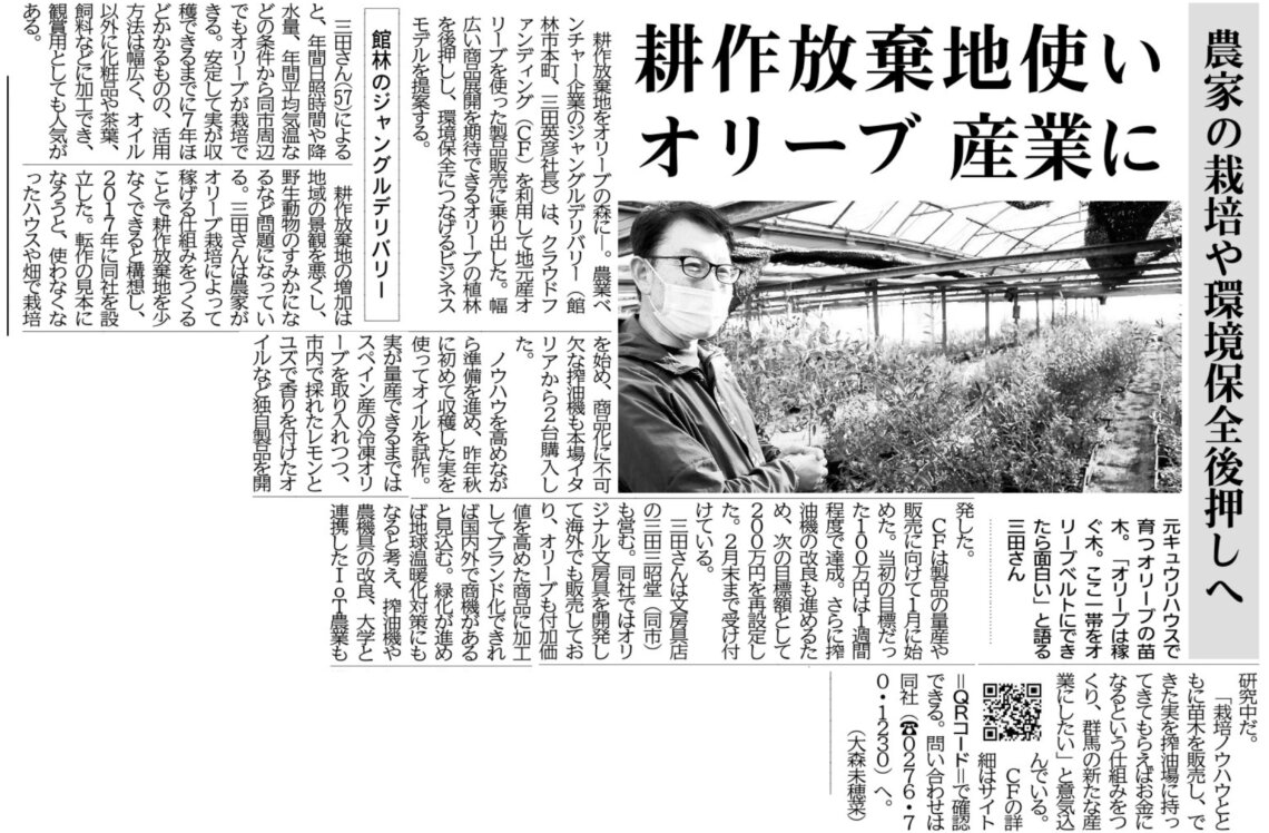 館林の気候に合ったオリーブに目をつけ、2017年に農業ベンチャー「ジャングルデリバリー」を起業。翌年には約2ヘクタールの耕作放棄地でオリーブの有機栽培を始めた。収穫した実はオイルや化粧品に加工して販売し、文具と同様に海外販路の拡大を目指している。