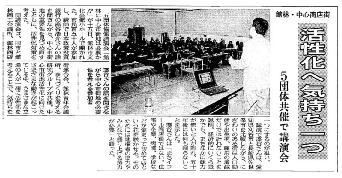 結婚を機に住み始めた館林市になじもうと、30代でPTAや消防団など12団体に所属。中でも青年会議所(JC)活動に力を入れた。2000年ごろには日本青年会議所(JC)の「まちなか創造推進委員会」に参加し、日本政策投資銀行の藻谷浩介さんと出会う。