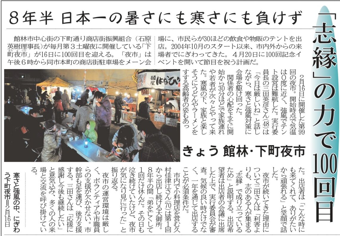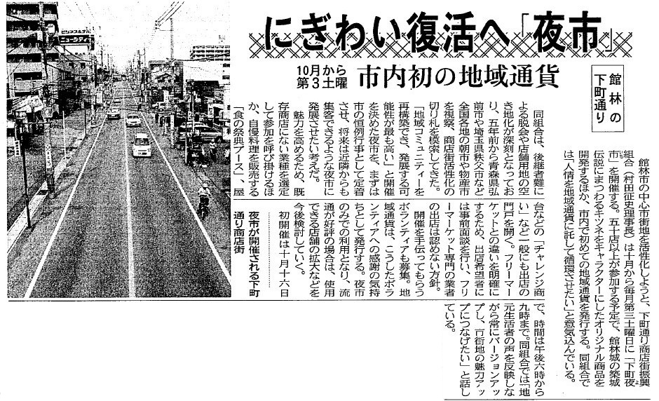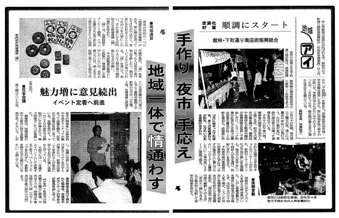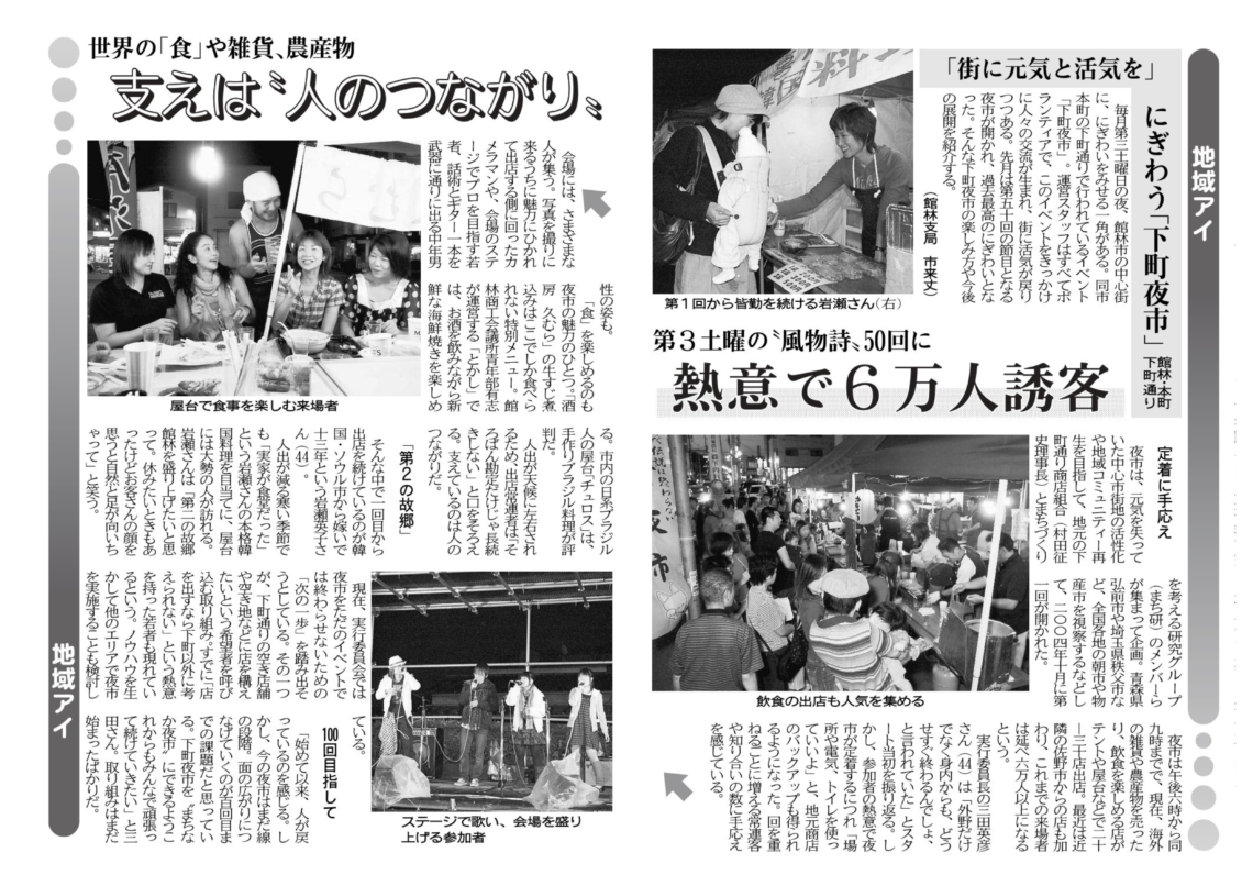 「十月十六日午後六時。関係者の期待と不安が入り混じる中、初めての夜市が幕を開けた。精肉店や金物店など既存の商店が営業時間を延長して参加したり、エスニック料理や紅茶などを扱う公募出店者の露店が約二十店軒を連ねた。店舗跡に作られた広場では手品やチェロのコンサートが行われ、射的やトランポリンなど子供が楽しめる空間も。地元の人を中心に二千四百人が足を運び、終始にぎわいを見せた。」