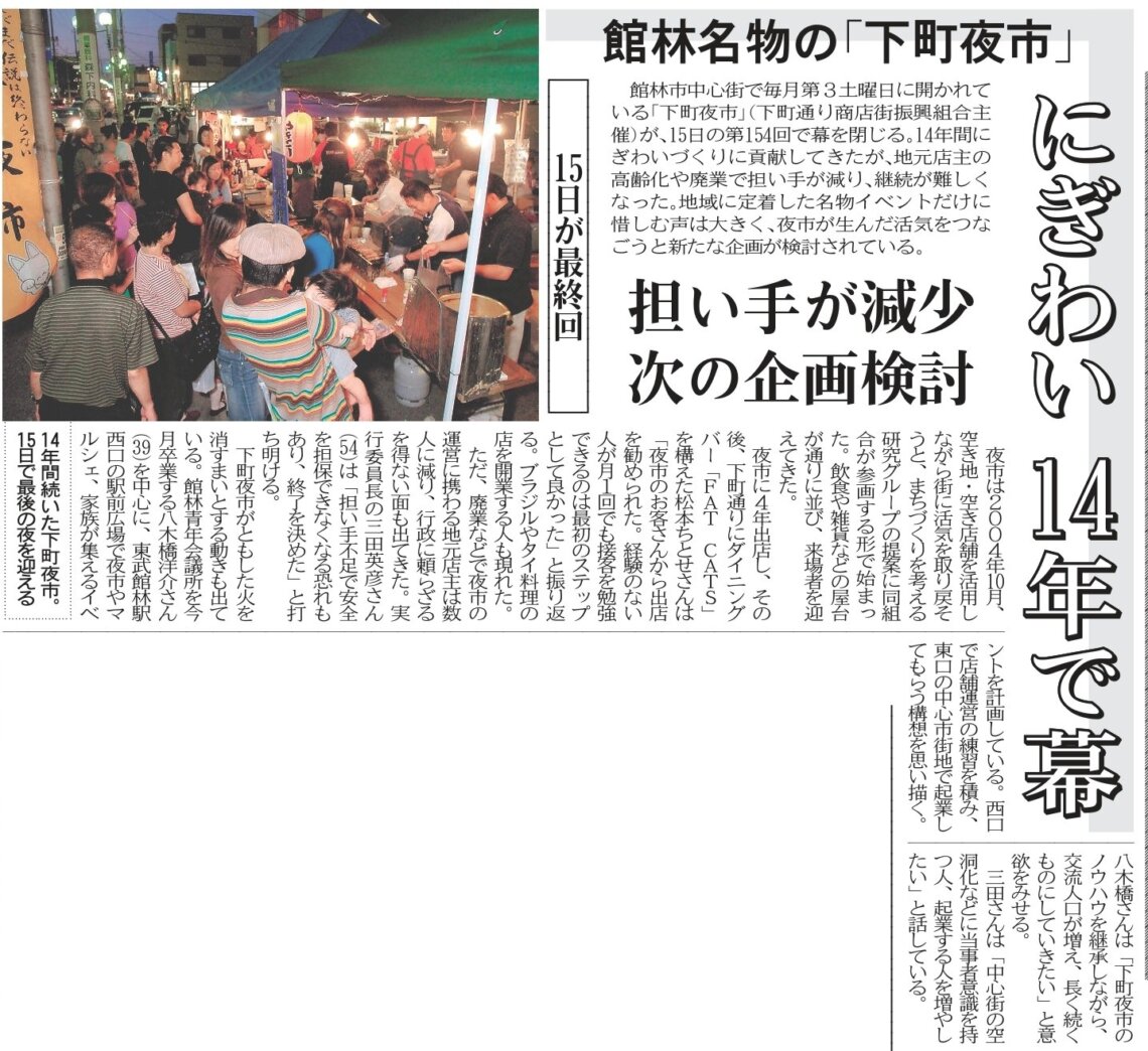 夜市の終了を報じた記事は、後継企画として東武館林駅西口駅前の野外マーケットの計画を伝えている。夜市の思いを絶やすまいと動いたのは、館林青年会議所で三田さんと行動を共にした八木橋洋介さん(44)だった。