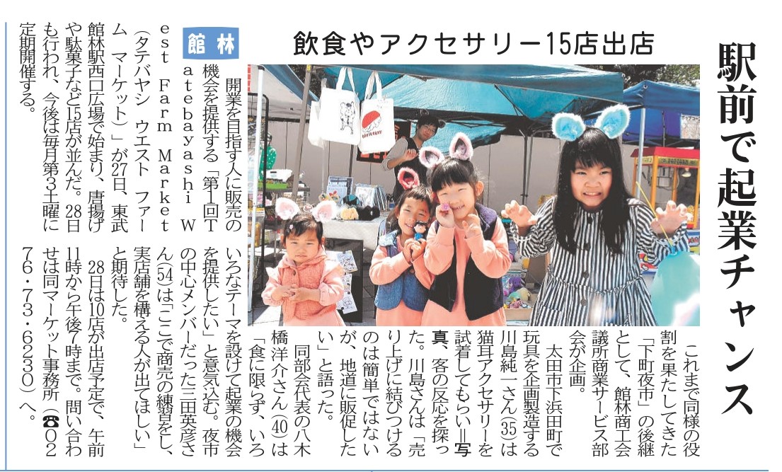 イベント名は「Tatebayashi West Farm Market(タテバヤシ ウエスト ファーム マーケット)」。下町夜市が掲げた創業支援の流れをくみ、西口のマルシェで店舗運営の練習を積み、東口の中心市街地で起業してもらう構想を描く。記事の中でも、八木橋さんは「下町夜市のノウハウを継承しながら、交流人口が増え、長く続くものにしていきたい」と意欲を語っている。