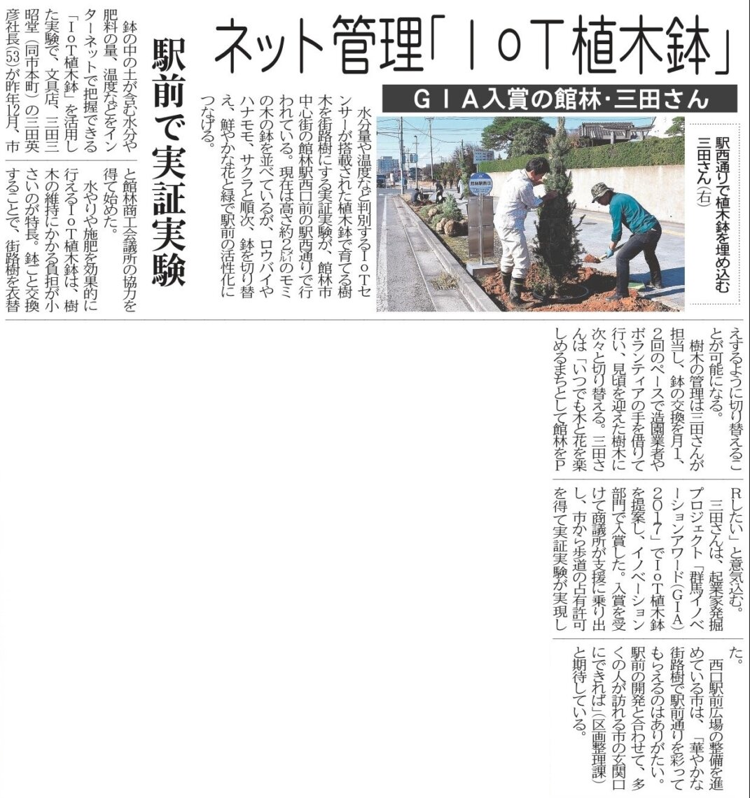 館林の「外」へ出て学ぼうと、起業家の発掘や育成を目的とした「群馬イノベーションスクール」(GIS、田中仁財団主宰)に参加。起業家発掘プロジェクト「群馬イノベーションアワード(GIA)」にも出場し、季節ごとに多品種の樹木をシェアするサービス「IoT樹木鉢」を提案してイノベーション部門の入賞を果たした。