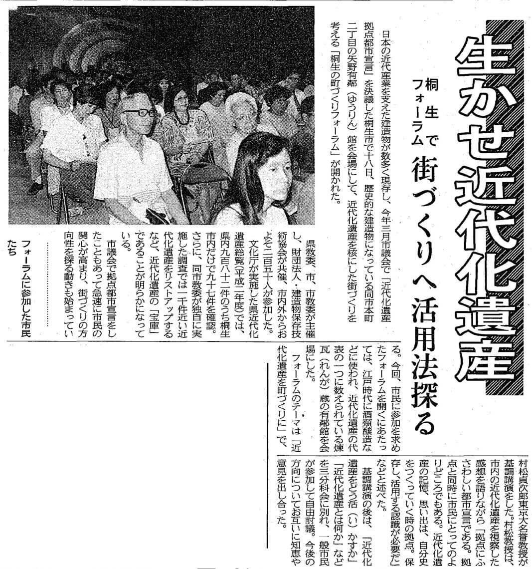 フォーラムの講師は、近代建築史の著名な研究者だった村松貞次郎氏(故人)。村松氏と群馬県のかかわりは深い。1990~91年度には、村松氏が主任調査委員を務め、文化庁による全国初の「近代化遺産総合調査」が群馬県で実施された。同調査によって、富岡製糸場など絹産業遺産に光が当たり、後の世界文化遺産登録運動につながる近代化遺産の保存活動のうねりが起きていく。