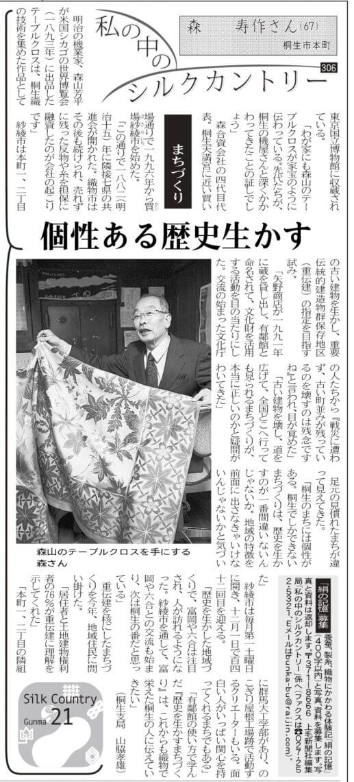 森さんは、本町通りに面した「森合資会社」の4代目で、現在も会長を務める。同社は1904(明治37)年創業。織物産業と関わりが深い不動産業や金融業で成長し、現在は保険代理業を営む。白磁のタイルが特徴的な大正期建築の事務所と、隣接する明治期の店蔵は、国登録有形文化財の貴重な近代化遺産だ。