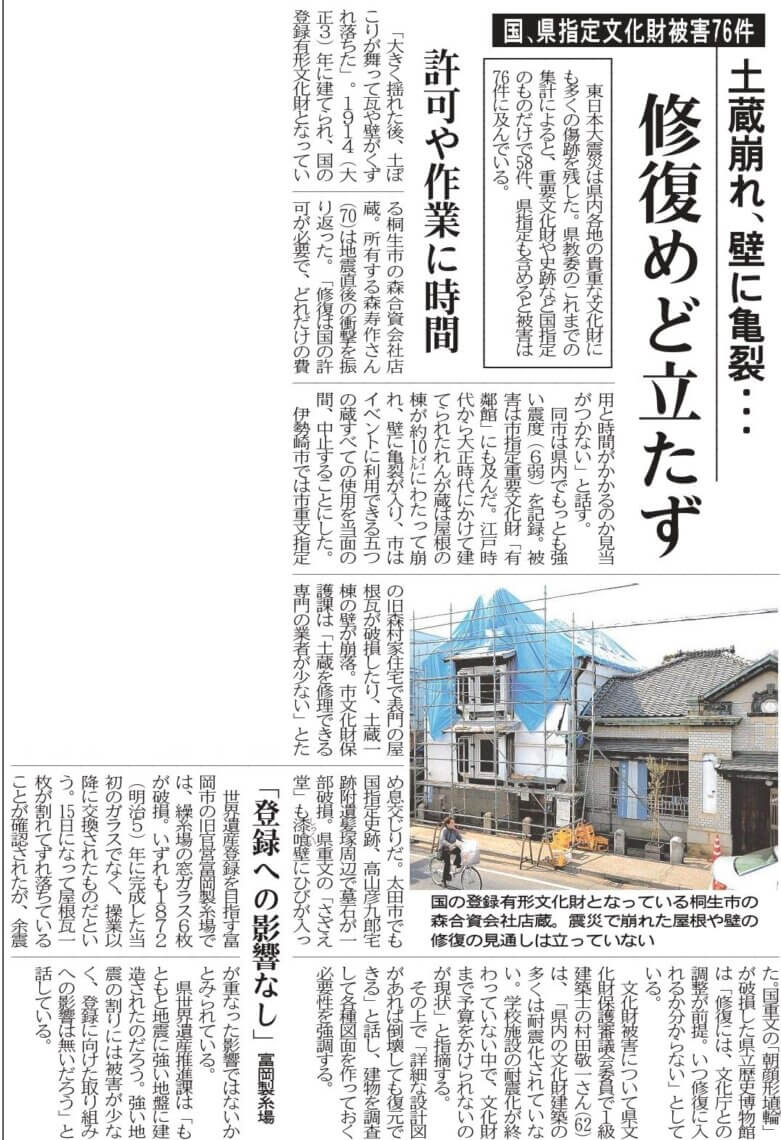 森合資会社の店蔵も、大きな揺れで瓦や壁が崩れ落ちた。文化財の修復には国の許可が必要となり、かかる費用や時間も見通せない。