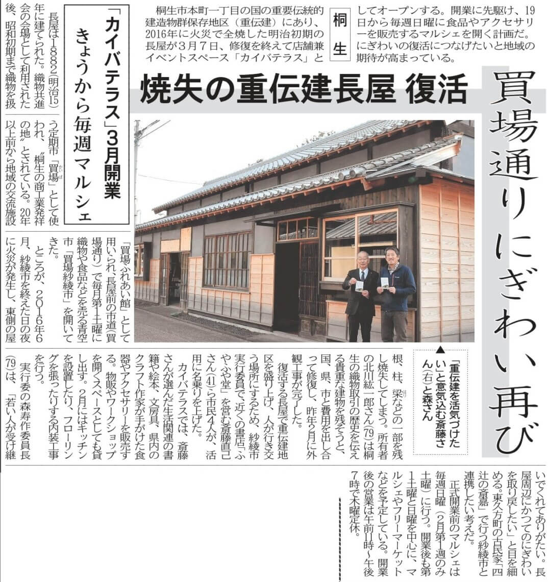 長屋だった建物は、元は買場紗綾市の拠点となる交流施設「買場ふれあい館」として使われていた。ところが2016年6月、紗綾市を終えた日の夜に火災が発生し、東側の屋根、柱、梁(はり)などの一部を残し焼失。桐生の織物取引の歴史を伝える貴重な建物を残そうと、国、県、市が費用を出し合って修復し、2020年3月からカイバテラスとして開業した。