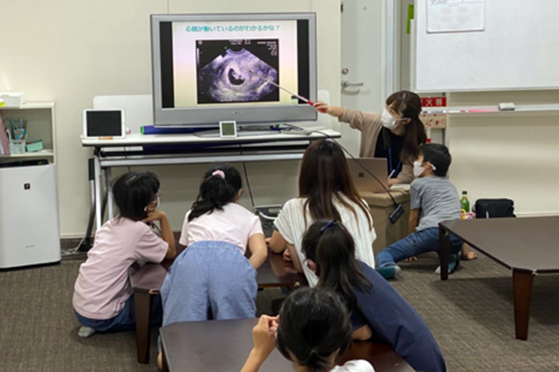 「これは、お母さんのお腹の中にいる赤ちゃんです。9週目でまだ小さいけれど、ちゃんと心臓が動いているのが分かるかな?赤ちゃんの鼓動は1分間に約150回ととっても早いの。みんなも心臓の音を聞いてみましょう」