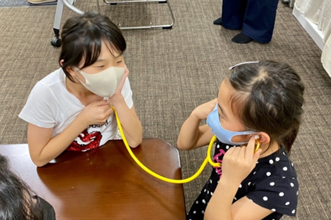 聴診器を自分や友達の胸に当て、「聞こえる、聞こえる」、「トクトクなってる」と心音に耳を傾ける子どもたち。命の音を肌で感じることができる貴重な体験です。