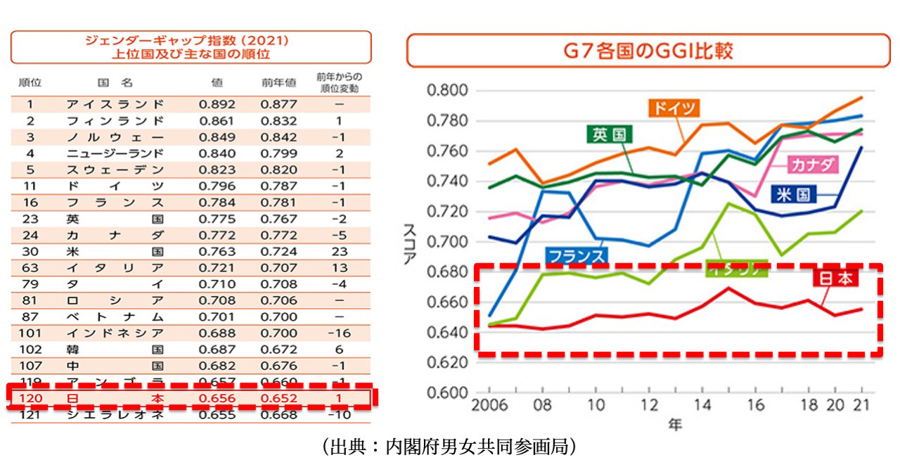 ここにあるのは世界の男女格差の度合いを測った国際調査です。残念ながら日本は、各国のランキングで最低レベルに近いくらい、ジェンダー平等が実現できていない国です。G7でも最下位をひた走っていて、これは主要先進国の中で一番「女性が活躍できていない国」である事実も示唆していると思います。だからこそ、裏を返せばそこが日本の伸びしろであり、希望、チャンスであるとも言えます。