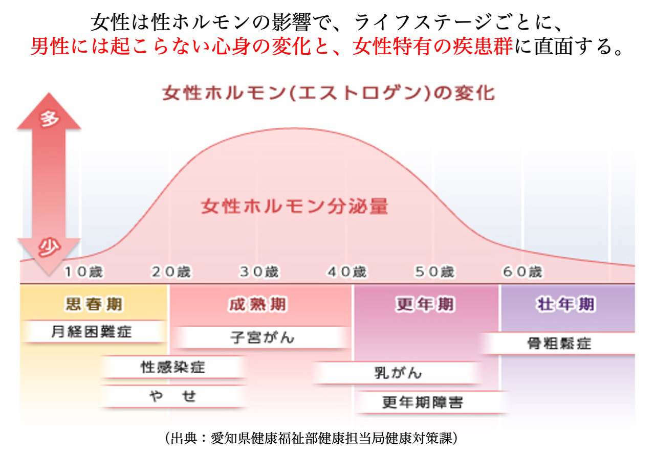 この時に、抜きに語るわけにいかないのが今日の主題であり、私が人生をかけて取り組んでいくライフワークでもある、女性の体と健康のこと、です。少し乱暴な言い方かもしれませんが、働き盛りの女性は男性より倒れる確率が高い。これは客観的にも明らかな統計事実です。その根拠をひも解く上で、最も重要なキーワードがホルモンです。女性の体を知ることは、女性ホルモンを知ることでもあります。男性ホルモンは一生涯緩やかに変動しますが、かたや、多くの女性にはいわゆる月経(生理)があり、ホルモンの波はライフステージを通じて大きく山なりに変化すると同時に、月経、排卵、次の月経と非常に小刻みな変動が思春期以降、毎月繰り返されます。これは男性の体には起こらない女性特有の体の変化です。このホルモンの影響下で小さな不具合から大きな疾病まで様々なことが40年から50年の間に渡り、女性の体に起こり続けます。