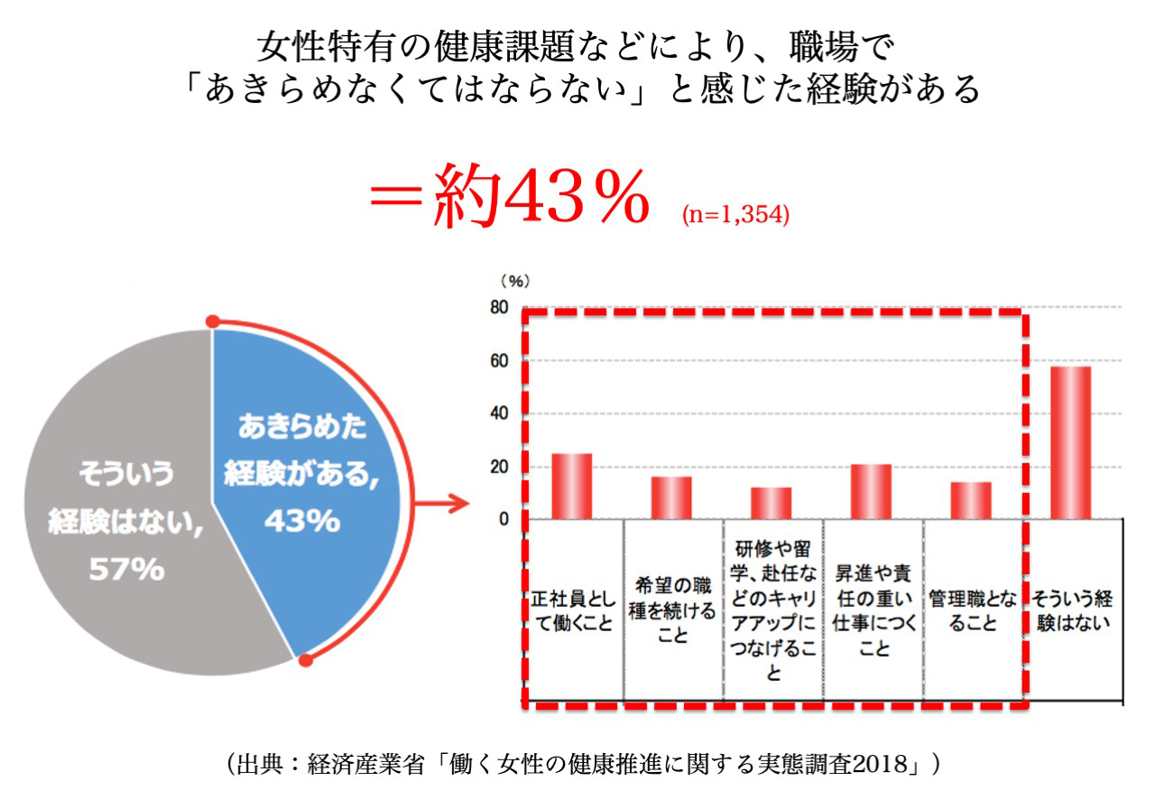 例えば、女性特有の健康課題を理由に「職場で何かをあきらめなくてはならないと感じた経験」のある女性は全体の43%にも上ります。「正社員をあきらめた」「希望の職種をあきらめた」「管理職・昇進をあきらめた」。本人が活躍したくても、体や心に悩みを抱えながら働いているので十分なパフォーマンスを発揮できないということが、水面下で繰り返されてしまっている現状が、このデータからも想像できます。