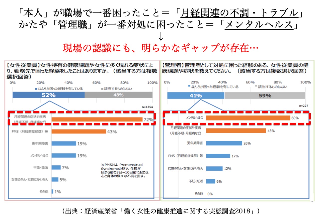 ここで、職場のマネジャー層と当事者本人との間では、どんな理解のギャップがあるかを示す象徴的なデータをお見せします。一例に、職場で一番困った健康問題はどんなことかを聞いた調査です。働く女性たち本人は、「私、月経(生理)のトラブルで困ってます」という答えが1位でしたが、管理職側は、彼女たちの健康問題にかかわることで一番支援や対処に困ったことは何か、という問いに「メンタルヘルス」と答えています。女性は圧倒的に月経で困っているのに対し、管理職側はいや、そうではなく、メンタルヘルスのことだと言っていて、明らかに両者にはズレがあります。それもそのはず、この問題は本人がどんなに困っていようと支援側からは見えない。つまり、月経は先ほどのサイレントの問題の最たるものだからなんですね。