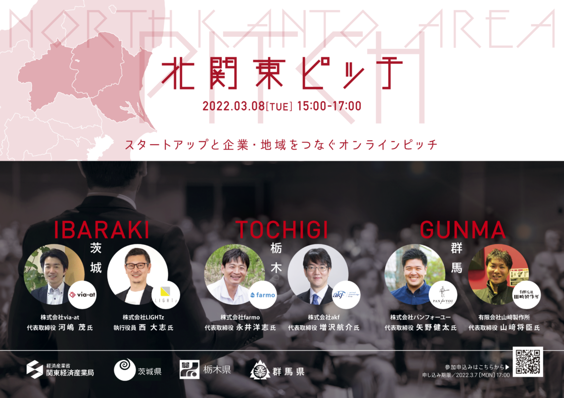 茨城県、栃木県、群馬県の北関東3県と関東経済産業局が強力タッグ。各県から2社のスタートアップが登壇し、県境を越えたネットワークを目指して熱量を込めたプレゼンを放ちます。
