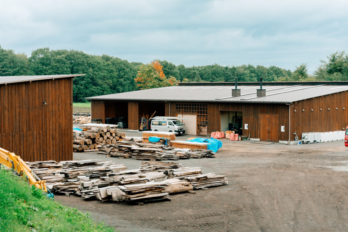 きたもっくの地域資源活用事業の拠点となるのが、スウィートグラスから2.6キロほど離れた場所にある、あさまのぶんぶんだ。ここは製材所、薪製造所、家具工房であり、林業や養蜂業の拠点でもある。野外には、きたもっくが所有する二度上山等で伐採された樹木から製材された板が山積みに積まれ、丸木1本がそのまま製材できる大型機械もある。