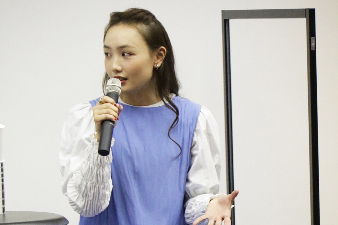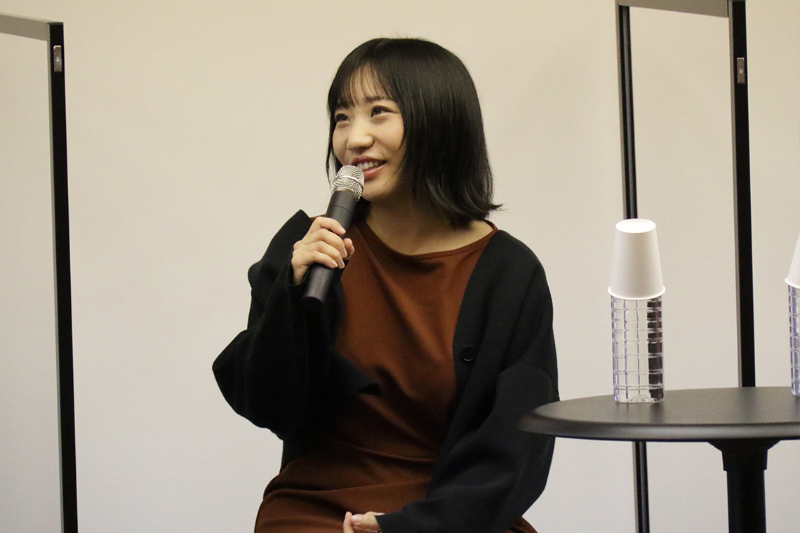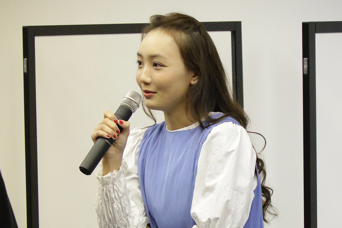 手島 実優(以下 手島):お集まりいただいてありがとうございます。手島実優と申します。俳優をやっています。私は前橋市出身なんですけど、地元なので、群馬と言えば・・からっ風ですかね。中学校バトミントン部で部活帰りにからっ風の洗礼を受けて、田んぼに自転車のまま転げ落ちたことがありました。よろしくお願いします。