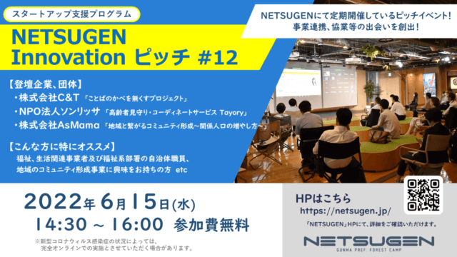 NETSUGEN Innovationピッチは、定期開催(原則毎月)するピッチイベントであり、スタートアップやベンチャー、新たなビジネスに取り組む事業者などによるピッチを実施し、事業連携や協業に向けた出会いの創出を目的に実施するものです。