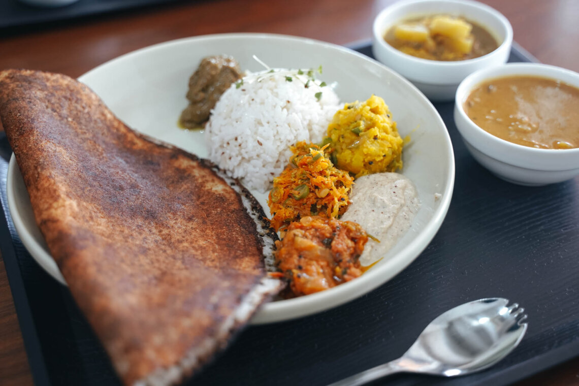 ナンとは異なり、ベースに米と豆を使った軽い食感のドーサ、小麦を全く使わないカレー、滋味深く色鮮やかな副菜。決まったメニューはなく毎週水曜日のビリヤーニ以外は完全に日替わりだが、ランチ営業の開店時点で満席となる日も多い人気店だ。
