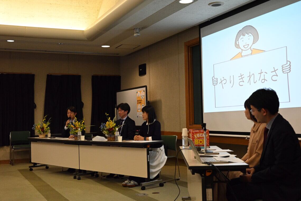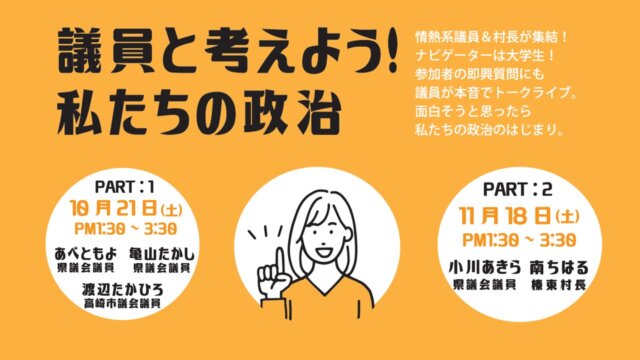 登壇者は、あべともよ県議会議員、亀山たかし県議会議員、渡辺たかひろ高崎市議会議員。情熱系議員3名とナビゲーターの大学生2名が熱いトークを繰り広げました。