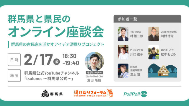 そのプラットフォームにおいて、令和4年12月 7日から令和5年1月10日まで意見募集をしていた「群馬県でのんびり数日間過ごすなら、なにをしたいですか?」というテーマについて、投稿いただいた意見の内容を深めるため、意見を投稿いただいた方々と山本一太群馬県知事による座談会を実施いたします!