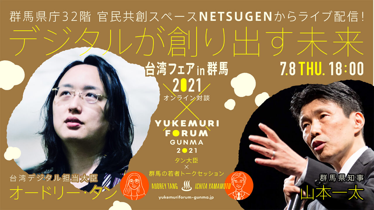 今回「台湾フェア in 群馬 2021」と「湯けむりフォーラム2021」のコラボレーション企画として、オードリー・タン大臣と山本群馬県知事の対談が実現。デジタル時代の社会のあり方から、With /Afterコロナの世界まで、幅広く議論をおこないます。当日は、群馬県内の若者とタン大臣のトークセッションもあります。